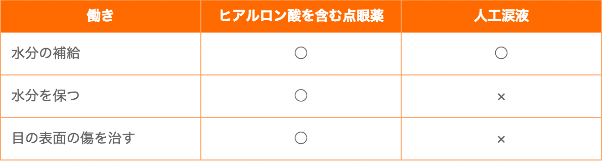 ドライアイの治療の基本は点眼です。「ヒアルロン酸」が配合されている点眼薬は、ドライアイの治療に効果的です。ヒアルロン酸には粘りがあり、水分を保つ効果があるため、単に水分を補うだけでなく、涙や点眼薬を長く目の表面に維持します。その上、ヒアルロン酸には、目の表面の傷を修復する効果もあります。また、ドライアイは、涙の量や成分が変化しているため、水分量を補う目的で「人工涙液」が使われる場合もあります。